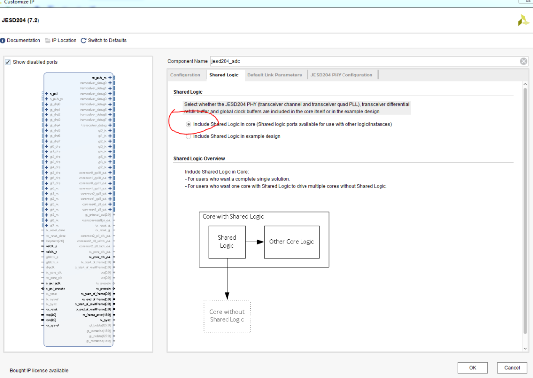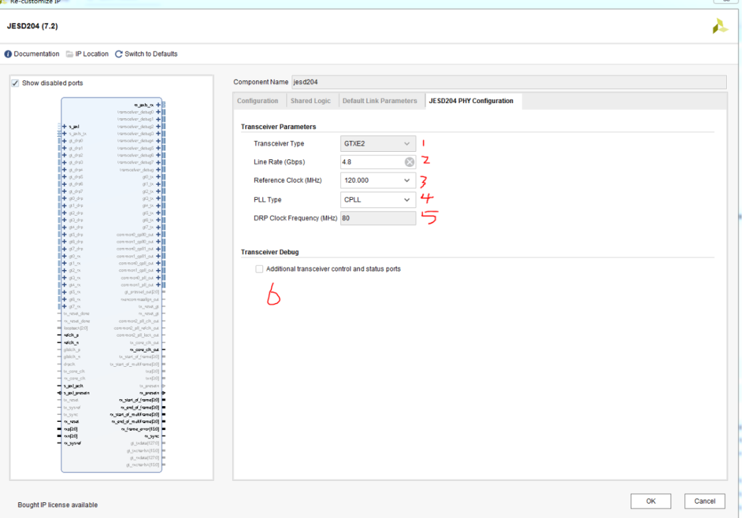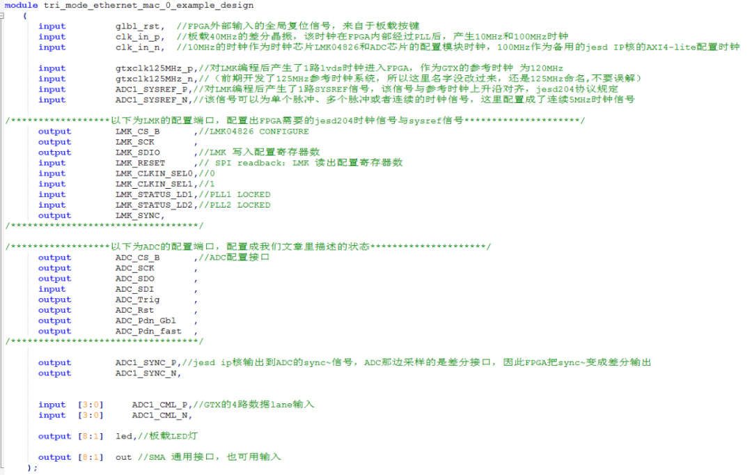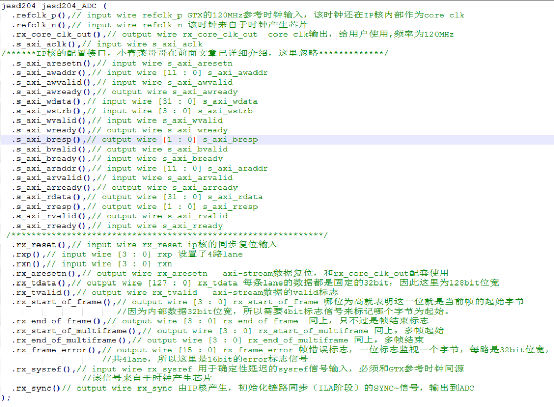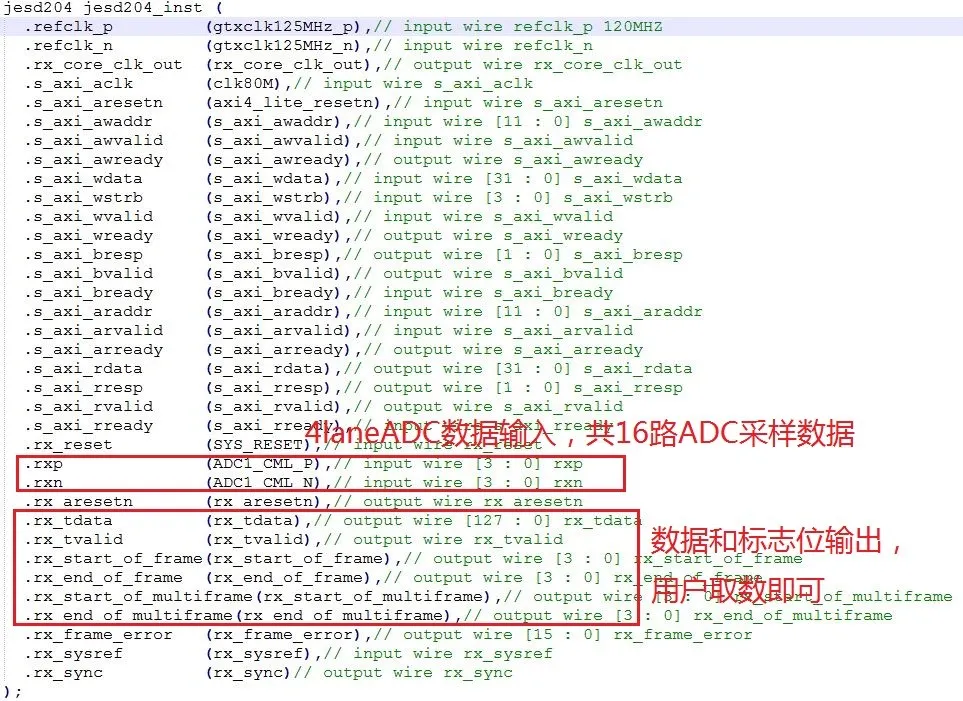 至此,jesd204的IP核就配置完成了。例化该IP核后,其生成的ip核端口信息如下图12所示(带信号注释):