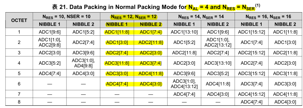 我们再来看看ADC数据的传输层数据结构。该ADC手册描述输出数据有“NORMAL PACKING MODE”和“ SINGLE CONVERTER PER OCTET MODE”两种模式,为了提高位传输效率,本人选择了“NORMAL PACKING MODE”,如图3所示: