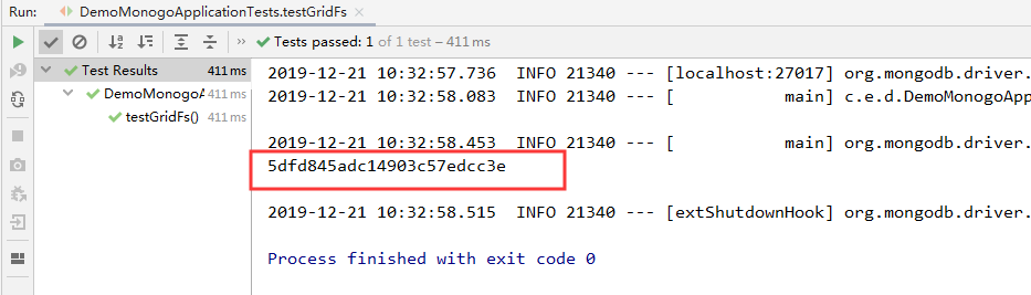 class DemoMonogoApplicationTests {@AutowiredGridFsTemplate gridFsTemplate;@Testpublic void testGridFs() throws FileNotFoundException {//要存储的文件File file = new File("D:\\test\\user_selected.png");//定义输入流FileInputStream inputStram = new FileInputStream(file);//向GridFS存储文件ObjectId objectId = gridFsTemplate.store(inputStram, "user_selected.png", "image/png");//得到文件IDString fileId = objectId.toString();System.out.println(fileId);}}
