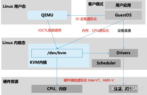 2)QEMU设备模拟:实现IO虚拟化与各设备模拟(磁盘、网卡、显卡、声卡等),通过IOCTL系统调用与KVM内核交互。KVM仅支持基于硬件辅助的虚拟化(如Intel-VT与AMD-V),在内核加载时,KVM先初始化内部数据结构,打开CPU控制寄存器CR4里面的虚拟化模式开关,执行VMXON指令将Host OS设置为root模式,并创建的特殊设备文件/dev/kvm等待来自用户空间的命令,然后由KVM内核与QEMU相互配合实现VM的管理。KVM会复用部分Linux内核的能力,如进程管理调度、设备驱动,内存管理等。