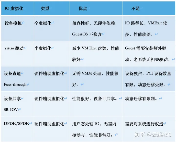 在虚拟化环境中,Guest的IO操作需要经过特殊处理才能在底层IO设备上执行。如表1,KVM支持5种IO虚拟化技术。