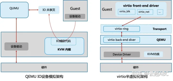 如图7,全虚拟化的设备模拟与半虚拟化的virtio驱动都是通过软件实现IO虚拟化。