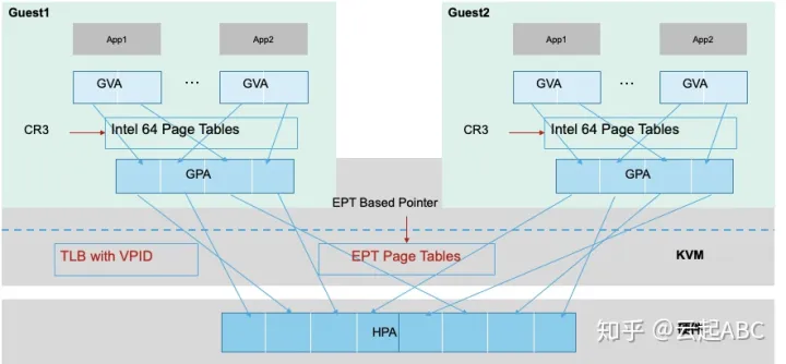 另外,CPU使用TLB(Translation Lookaside Buffer)缓存线性虚拟地址到物理地址的映射,地址转换时CPU先根据GPA先查找TLB,如果未找到映射的HPA,将根据页表中的映射填充TLB,再进行地址转换。不同Guest的vCPU切换执行时需要刷新TLB,影响了内存访问效率。Intel引入了VPID(Virtual-Processor Identifier)技术在硬件上为TLB增加一个标志,每个TLB表项与一个VPID关联,唯一对应一个vCPU,当vCPU切换时可根据VPID找到并保留已有的TLB表项,减少TLB刷新。