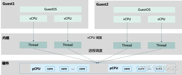 如图3,物理服务器上通常配置2个物理pCPU(Socket),每个CPU有多个核(core);开启超线程Hyper-Threading技术后,每个core有2个线程(Thread);在虚拟化环境中一个Thread对应一个vCPU。在KVM中每一个VM就是一个用户空间的QEMU进程,分配给Guest的vCPU就是该进程派生的一个线程Thread,由Linux内核动态调度到基于时分复用的物理pCPU上运行。KVM支持设置CPU亲和性,将vCPU绑定到特定物理pCPU,如通过libvirt驱动指定从NUMA节点为Guest分配vCPU与内存。KVM支持vCPU超分(over-commit)使得分配给Guest的vCPU数量超过物理CPU线程总量。