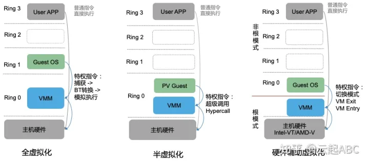 Intel对x86 CPU指定了4种特权级别Ring0 - Ring3,其中Ring 0是内核态,运行OS内核,权限最高,可执行特权或敏感指令,对系统资源进行管理与分配等;ring 3权限最低,运行用户应用。如图4,ESXi属于全虚拟化,VMM运行在Ring0完整模拟底层硬件; GuestOS运行在ring1,无需任何修改即可运行,执行特权指令时需要通过VMM进行异常捕获、二进制翻译BT(Binary Translation)和模拟执行。Xen支持全虚拟化(HVM Guest)与半虚拟化(PV Guest);使用半虚拟化时,GuestOS运行在Ring 0需要进行修改(如安装PV Driver),通过Hypercall调用VMM处理特权指令,无需异常捕获与模拟执行。
