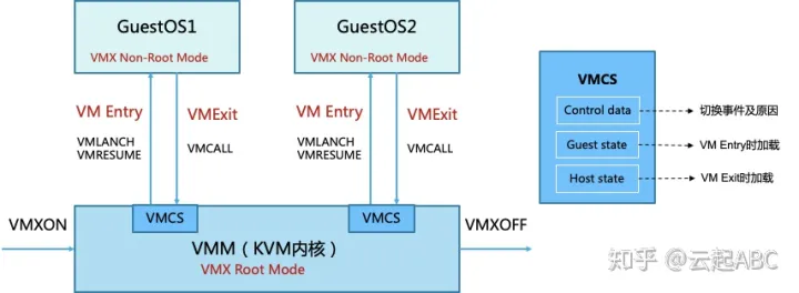 KVM是依赖于硬件辅助的全虚拟化(如Inter-VT、AMD-V),目前也通过virtio驱动实现半虚拟化以提升性能。Inter-VT引入新的执行模式:VMM运行在VMX Root模式, GuestOS运行在VMX Non-root模式,执行特权指令时两种模式可以切换。
