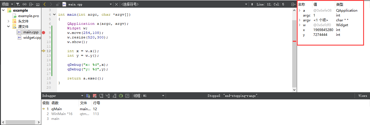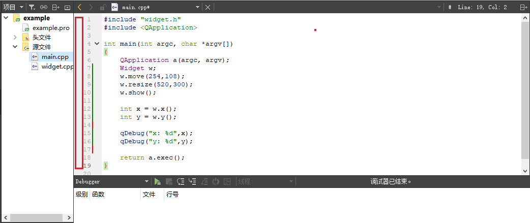 {QApplication a(argc, argv);Widget w;w.move(254,108);w.resize(520,300);w.show();int x = w.x();int y = w.y();qDebug("x: %d",x);qDebug("y: %d",y);return a.exec();