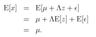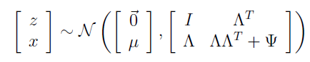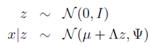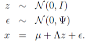 从高维向量x可由潜在的低维高斯型向量z线性表示出发,存在着以下假设,并且在下列分布中隐变量z与随机高斯噪声不相关: