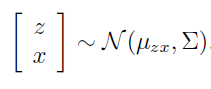 接下来,对于x和z的联合分布建模。由于p(x,z)=p(x|z)*p(z),两个高斯型密度函数的乘积仍然为高斯型,因此将x,z联合分布建模为高斯型如下:
