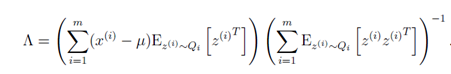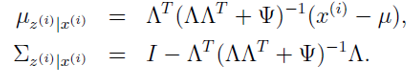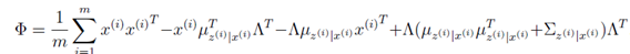 此方程比较复杂,很难直接解出,因此就需要利用上一讲介绍EM算法进行求解了。在上一讲最后利用高斯混合模型对于EM算法的流程已经进行过介绍了。对于高斯混合模型而言,隐变量z为离散型,而在因子分析中隐变量z则为连续性;其实就是将求和改为积分即可。下面给出EM算法的解参数步骤: