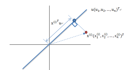 设样本空间存在单位方向向量u,那么某个样本点,在u上的投影长度 length 即为: