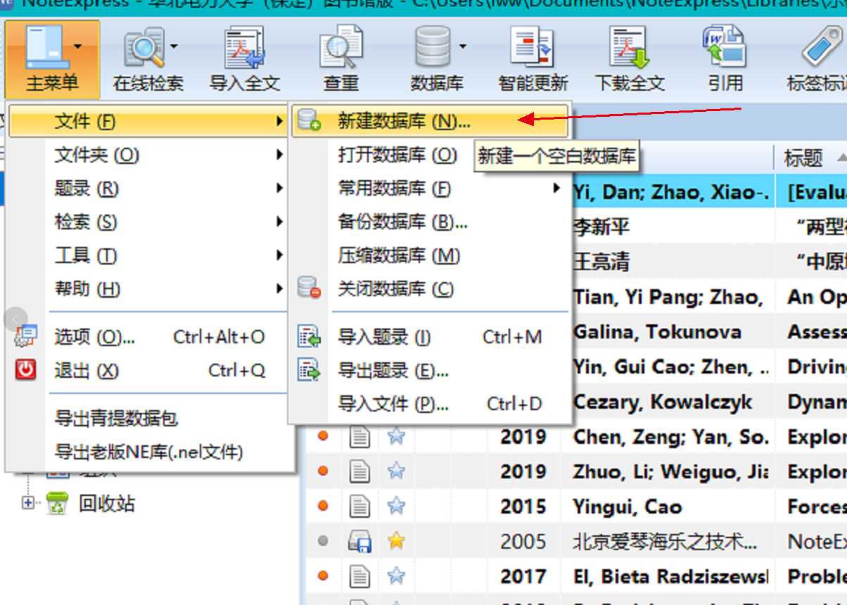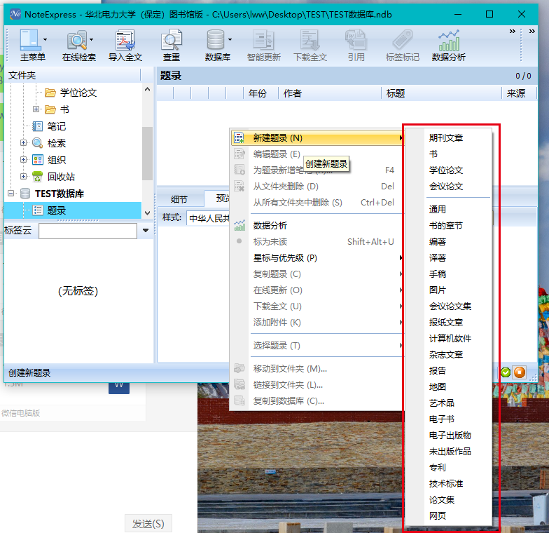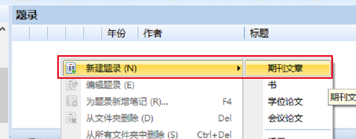 如图所示,右键-》新建题录-》选择我们需要录入的文献类型,然后自动跳出题录编辑对话框。