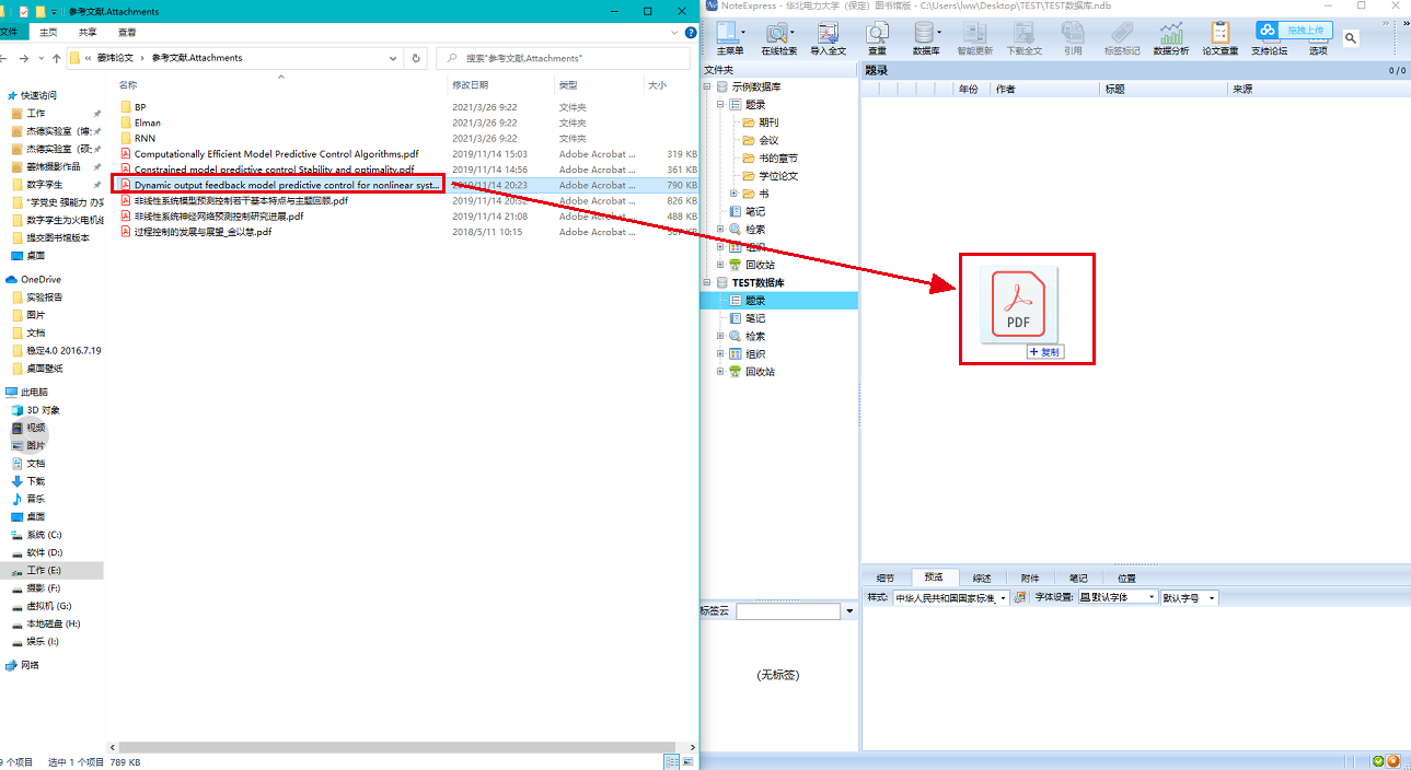 如上图所示,拖动我们想要入库的文献到NoteExpress界面上,然后释放鼠标,文献会自动加入到数据库中,同时文献也会自动复制到附件文件夹,如下图所示。