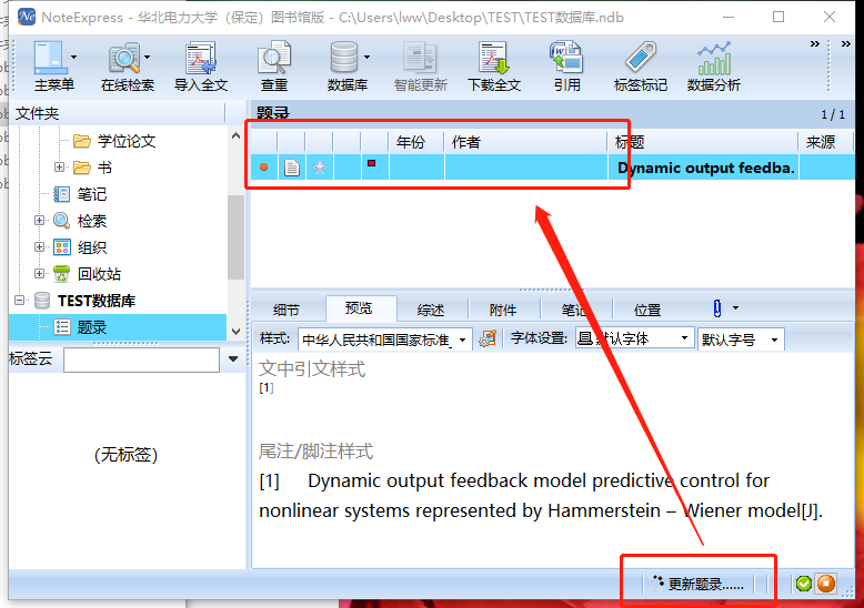 文献刚刚进入数据库后,系统右下角显示目前位于更新题录状态,系统正在自动识别导入文献的作者、年份等信息。
