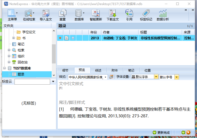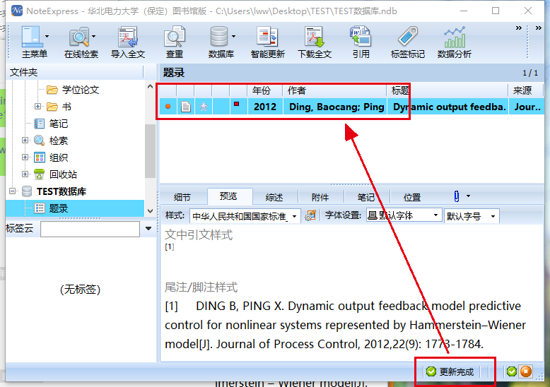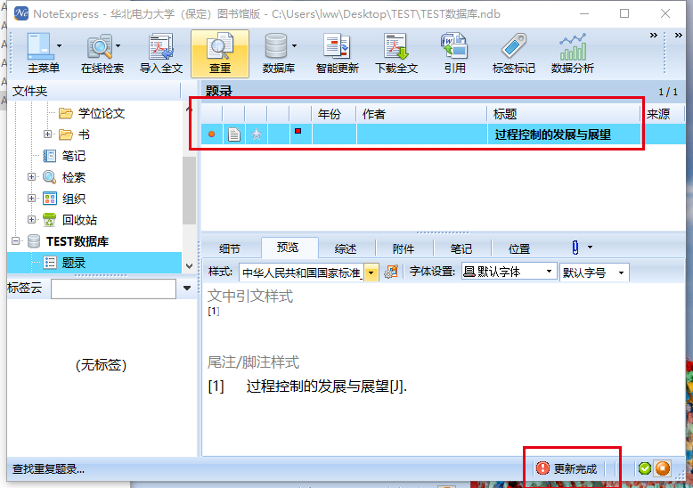 显示更新完成,软件找到了该文献的信息,如果智能更新无法找到的话,我们再通过手动更新来找一下。