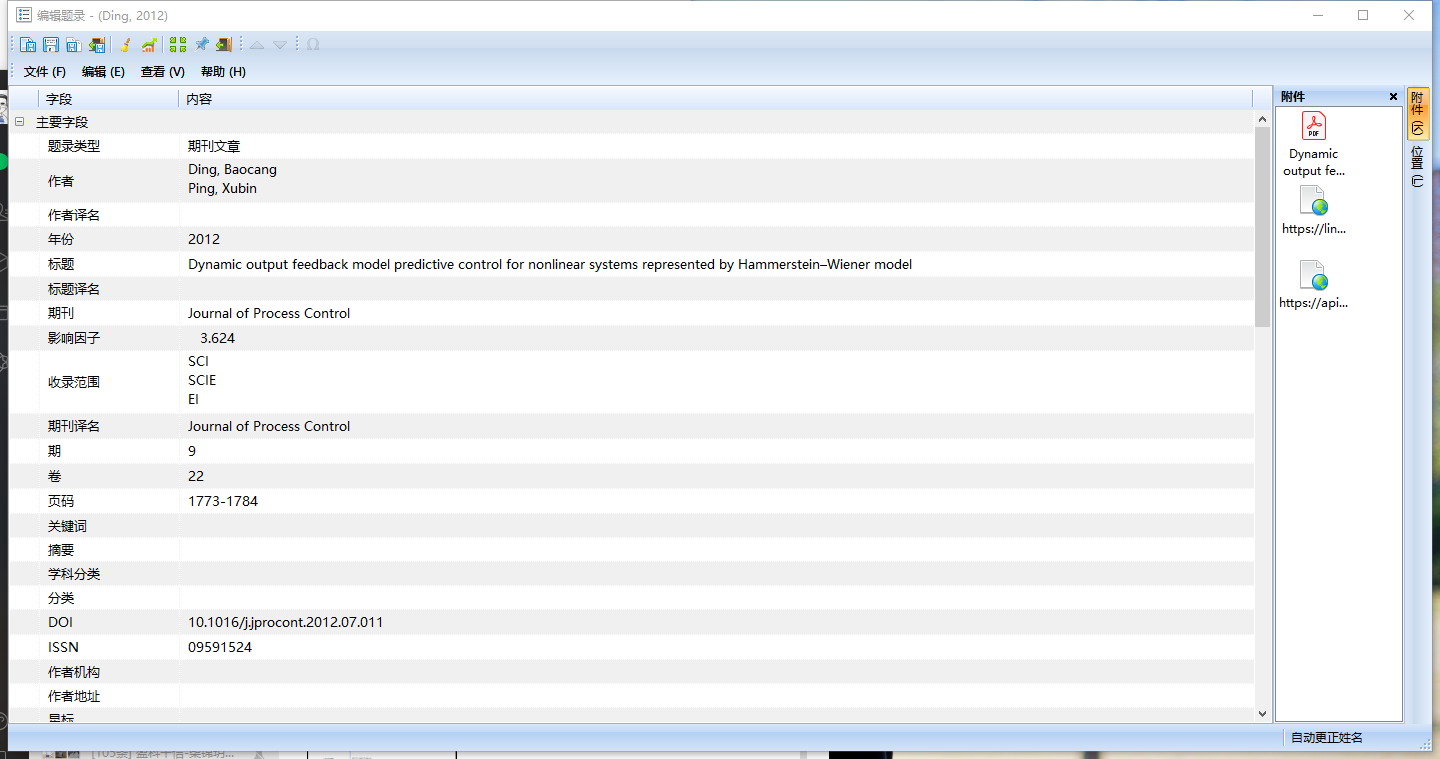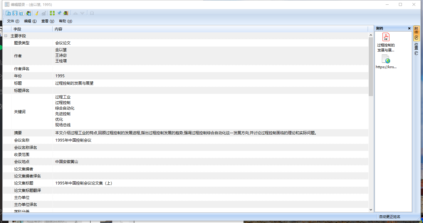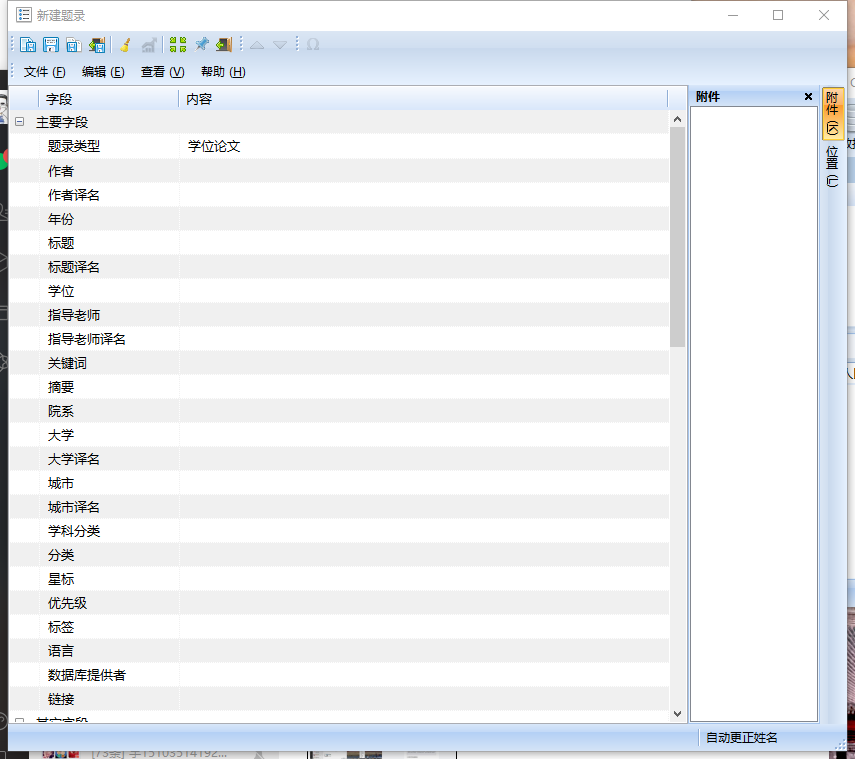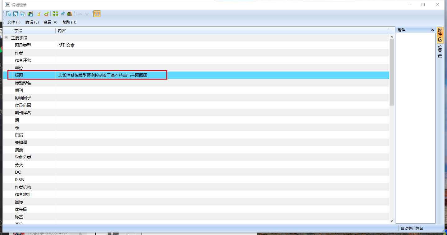 上图题录编辑界面中已有的信息是软件检索到的信息,我们可以核对信息的准确性。对于一些没有录入的信息,如果我们有需要,可以手动录入信息。