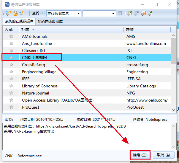 在弹出的对话框中选择我们要检索的数据库(文献从哪个数据库下载的,就检索哪个数据库),此处我们选择中国知网。