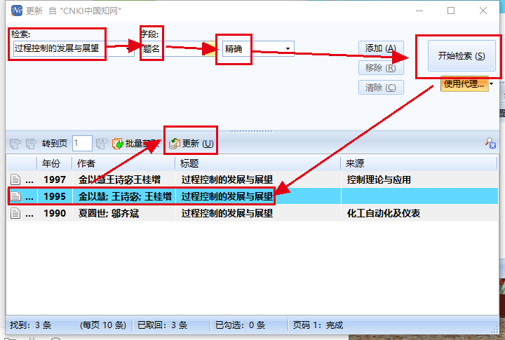 在弹出的界面中,我们输入文章名称,选择字段为“题名”,精确查找,点击开始检索。根据检索结果选择合适的条目,然后点击“更新”。