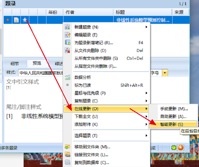 此时我们通过手动更新的方式来检索文献。在文献上点击右键-》在线更新-》手动更新。