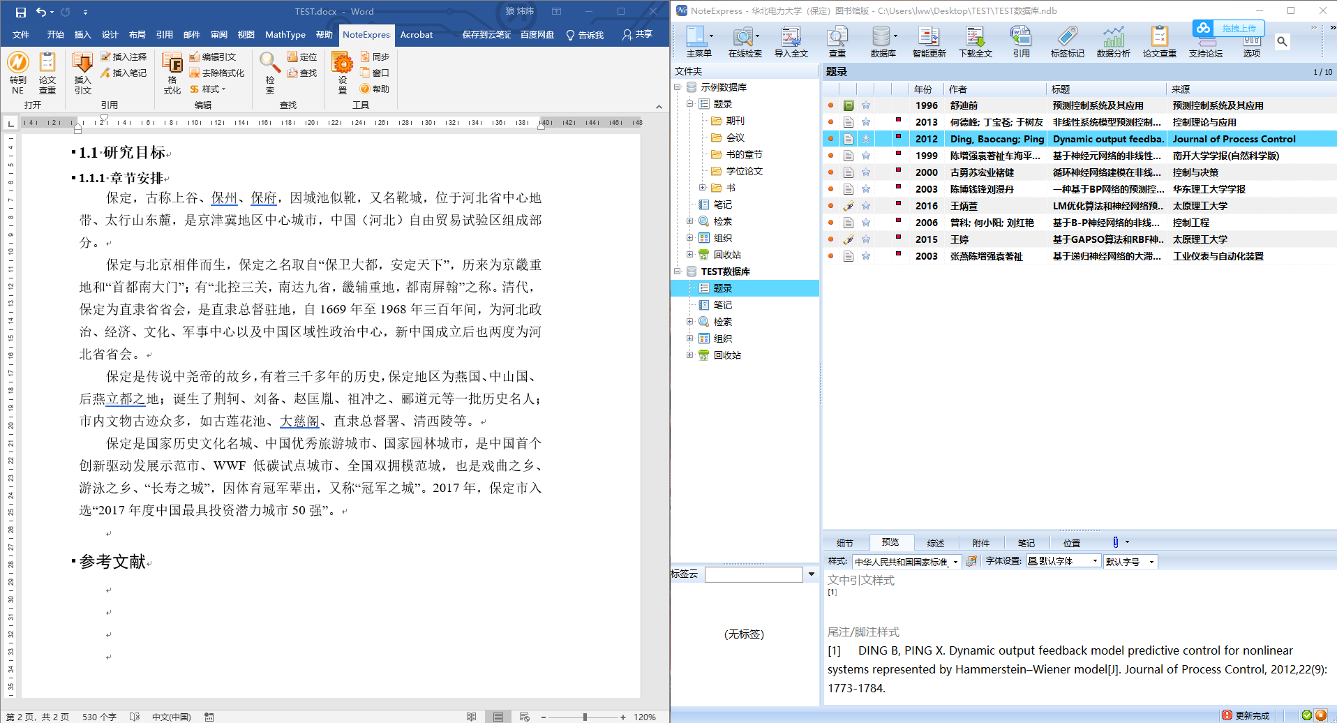 如下图所示,左边是我们编辑好的Word文档,右边是NoteExpress中我们新建好的数据库和数据库中加入的参考文献。
