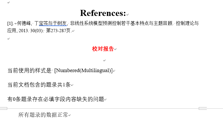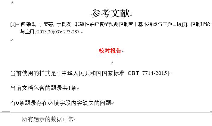 插入后,在文中会出现文献序号,在文末会出现引文列表和校对报告。