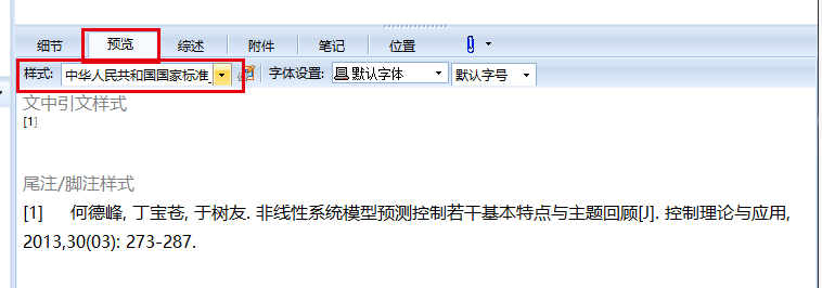 同时在NoteExpress中,底部有一个预览选项卡,我们可以在其中的样式里选择我们想要预览的样式,就可以预览到该样式下文献的引文和脚注样式等。