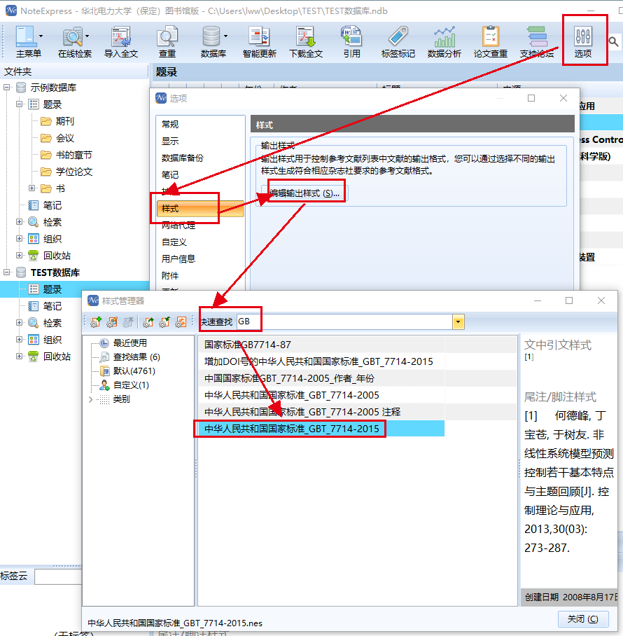 我们以国标样式为例,在NoteExpress中点击选项-》样式-》编辑输出样式-》-》查找GB-》双击GBT_7714-2015。