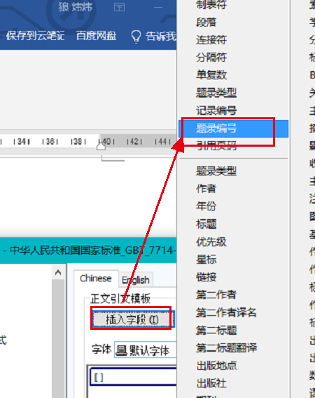 在中文选项卡下写“[]”,将光标挪到中括号中间,选择插入字段-》题录编号