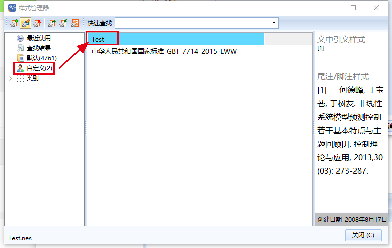 然后我们在样式管理器的自定义-》Test中就可以看到我们以国标为基础新建的样式。