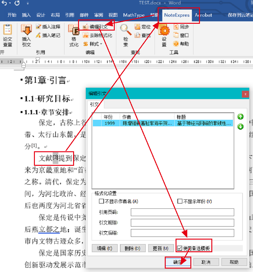我们将光标点在[2]处,然后点击Word中NoteExpress选项卡下的“编辑引文”-》勾选使用备选模板-》确定。