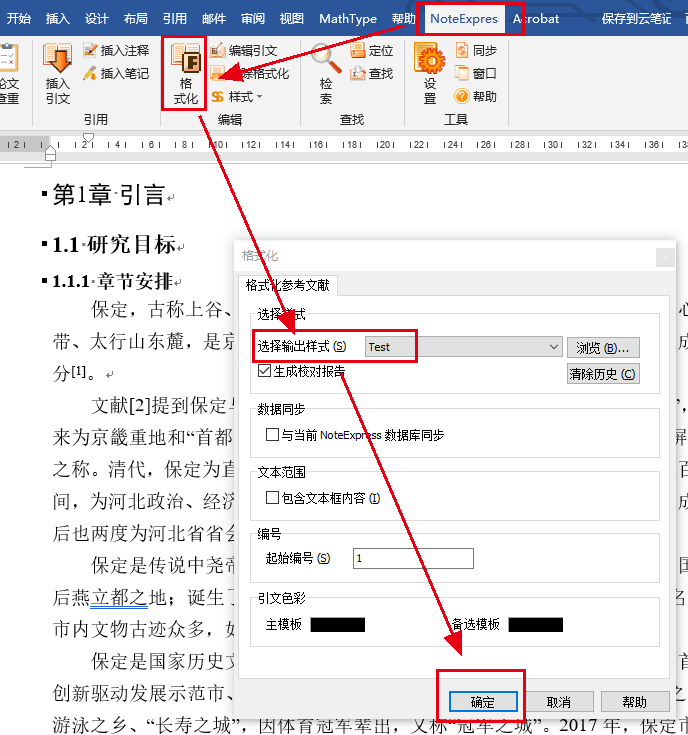 点击NoteExpress选项卡下的格式化按钮-》选择输出样式-》确定。