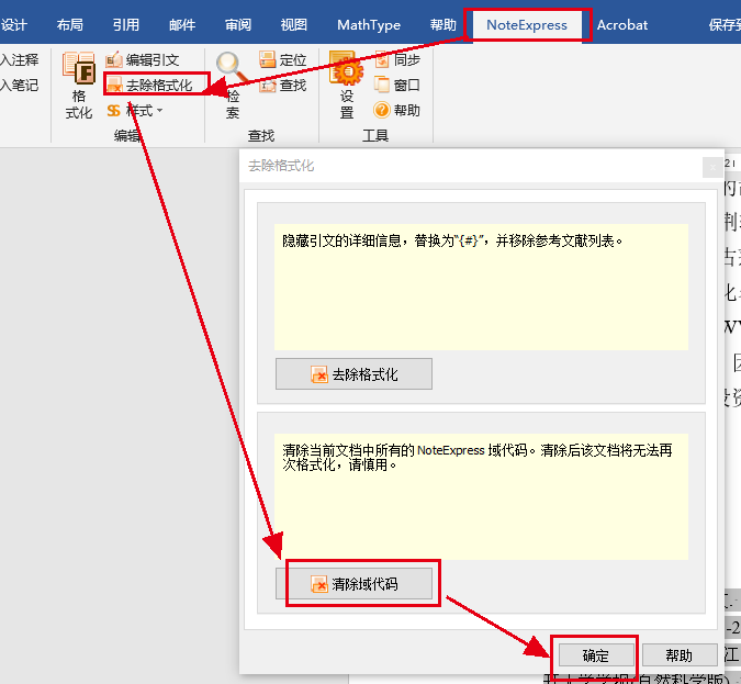 点击Word中的NoteExpress选项卡,点击去除格式化-》清除域代码,就可以清除掉NoteExpress在Word中创建的域代码,但是这个过程是不可逆的。