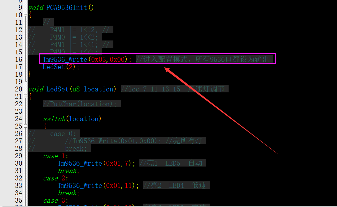 寻找不同之处,观察发现,在开机时候,初始化对PCA9536进行配置,而在后续的设置中没有进行设置。如下图。