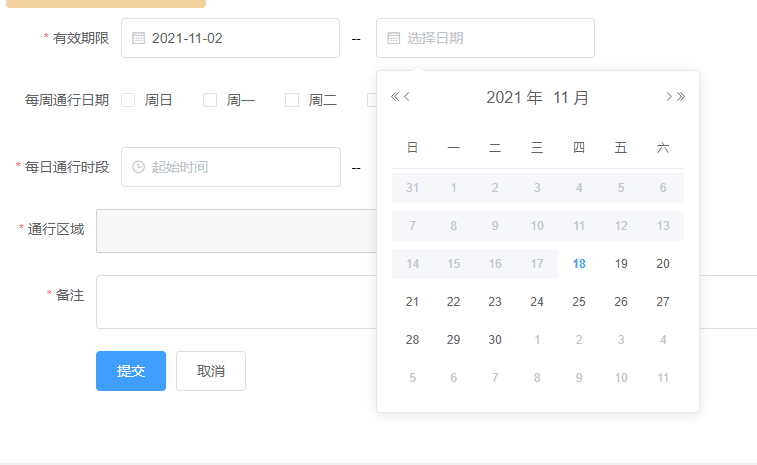 <el-form-item label="有效期限" ><el-col :span="6"><el-form-item><el-date-pickertype="date"placeholder="选择日期"value-format="yyyy-MM-dd 00:00:00"v-model="effectiveStartTime":picker-options="pickerOptionsStart"></el-date-picker></el-form-item></el-col><el-col class="line" :span="2">-</el-col><el-col :span="6"><el-form-item><el-date-pickerplaceholder="选择日期"value-format="yyyy-MM-dd 00:00:00"v-model="effectiveEntTime":picker-options="pickerOptionsEnd"></el-date-picker></el-form-item></el-col></el-form-item>