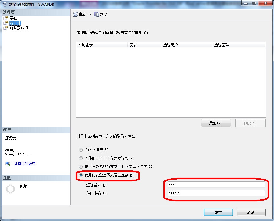 10.在“安全性”界面,勾选“使用此安全上下文建立连接”,输入“远程登录”和“使用密码”(oracle的登录名和密码):
