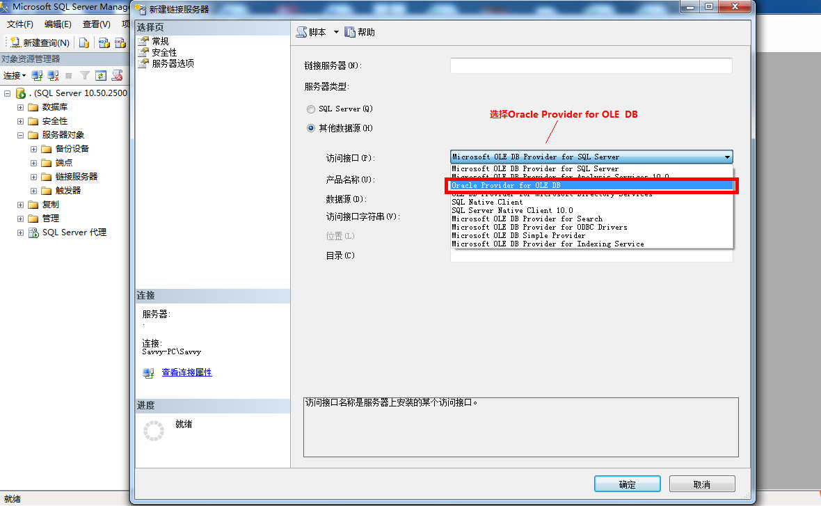 做完以上操作后,打开本机SQL Server Management Studio,新建链接服务器时,