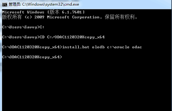 3. 在命令行界面进入解压文件夹后运行“install.bat oledb c:\oracle odac”安装:
