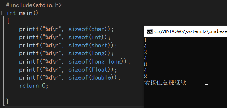 long long 占8个字节;float占4个字节;