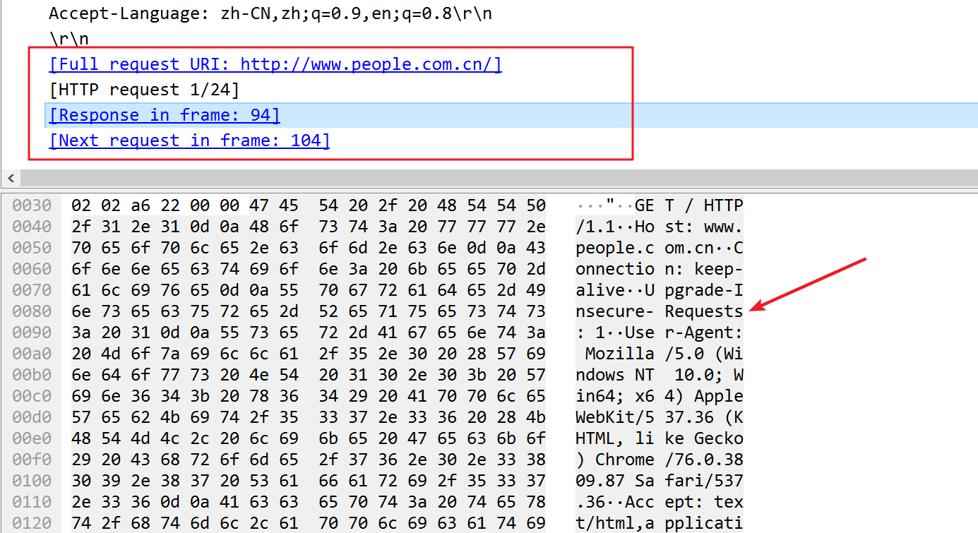 值代表的意思是保持连接。这样子有利于在你访问的网页中有很多图片等其他资源的时候,可以使用同一个TCP连接接收,而不是针对每一个文件都建立一次TCP/IP的连接。这个也就是课本上面说的“持久连接”。 - Upgrade-Insecure-Request:1。