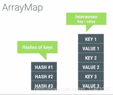 这样做的好处就是它避免了为每个加入到map的实体构造额外的对象。在ArrayMap大小增长的时候,我们也只需要复制两个数组的实体,而不需要重新构建一个hash map。
