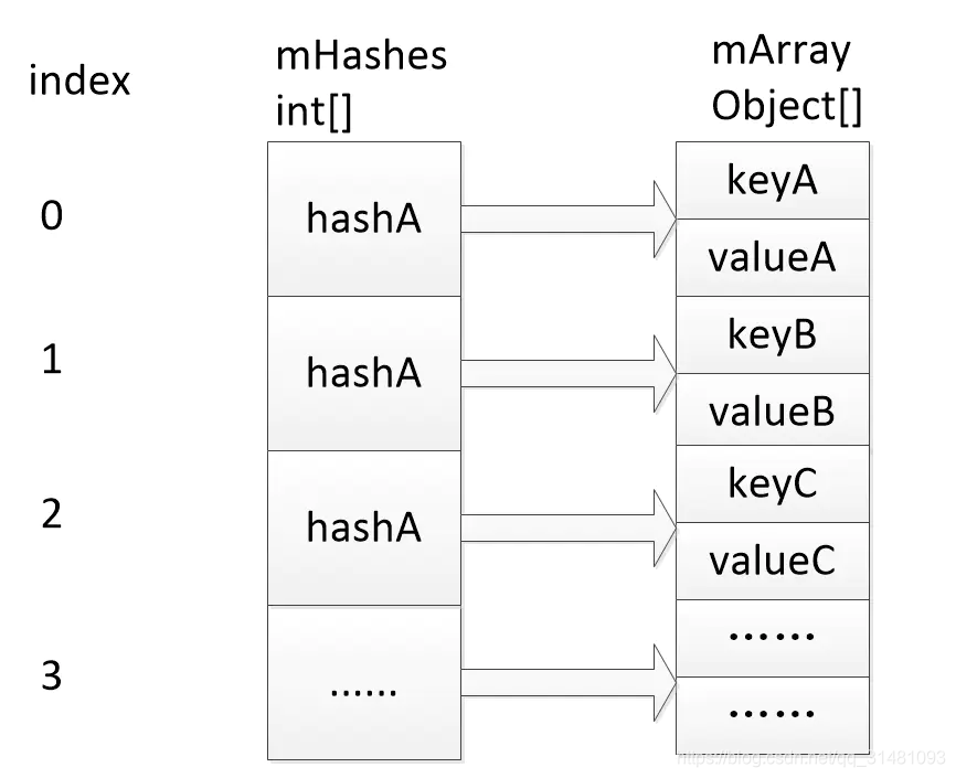 如上图所示,在ArrayMap内部有两个比较重要的数组,一个是mHashes,另一个是mArray。