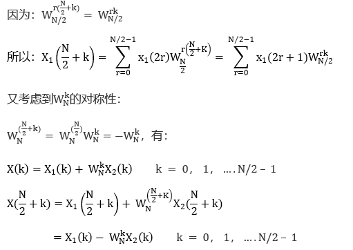 其中k = 0, 1,…. N/2 – 1。 和 只有N/2个点,以N/2为周期;而X(k)却有N个点,以N为周期。要用x1(k)和x2(k)表达全部的X(k)值。还必须利用系数的周期特性。