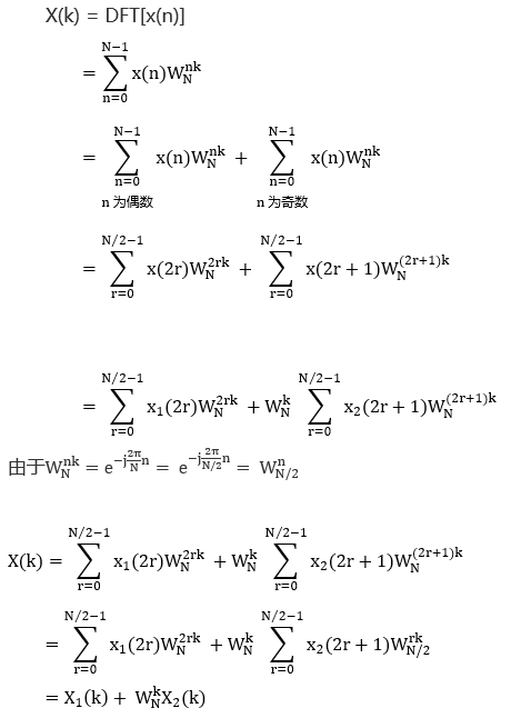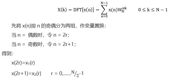 设输入序列长度为N = 2M(M为正整数),将该序列按时间顺序的奇偶分解为越来越短的子序列,称为基2按时间抽取的FFT算法。也称为Coolkey-Tukey算法。