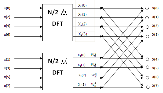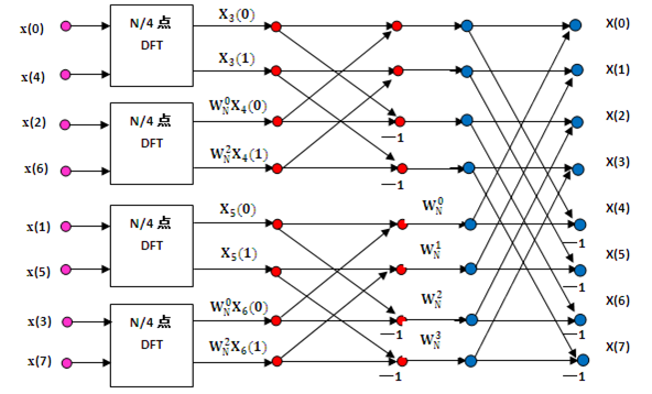 因此可以对两个N/2点的DFT再分别作进一步的分解。将一个8点的DFT可以分解成四个2点的DFT,直到最后得到两两点的DFT为止。