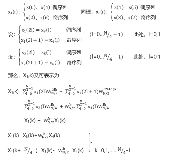 若将N/2(4点)子序列按奇/偶分解成两个N/4点(2点)子序列。即对将x1(r)和x2(r)分解成奇、偶两个N/4点(2点)的子序列。