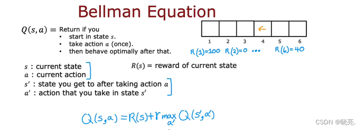 贝尔曼方程是强化学习中最重要的一个方程式。如果可以计算状态S 的状态动作函数 Q(s,a),那么它为我们提供了一种从每个场景中选择一个好的动作的方法。只需选择动作A,它会为什么提供Q(s,a) 的最大值。现在的问题是,如何计算Q(s,a)?在强化学习中,有一个称为贝尔曼方程(bellman equation) 可以帮助我们计算状态动作函数Q。