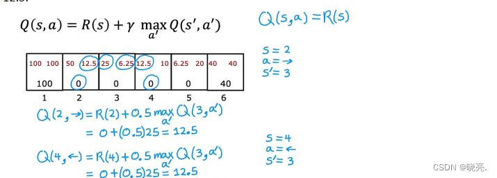 这时候应用贝尔曼方程,带入公式,如图,确保Q(s', a')最大,所以下一步会向左运行,最后的结果为12.5.