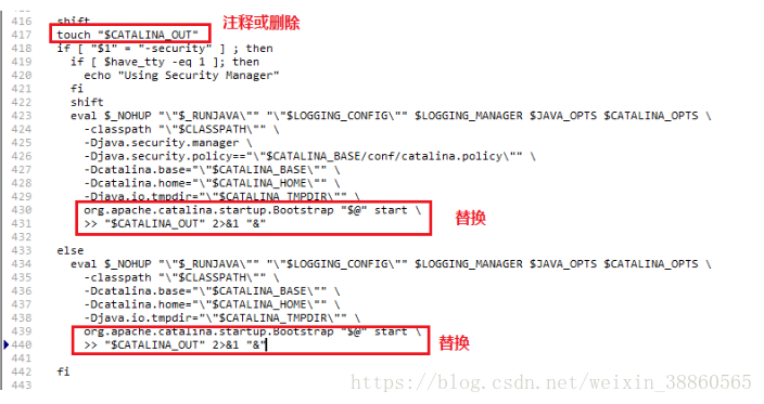 修改为:shift# touch "$CATALINA_OUT"if [ "$1" = "-security" ] ; thenif [ $have_tty -eq 1 ]; thenecho "Using Security Manager"fishifteval $_NOHUP "\"$_RUNJAVA\"" "\"$LOGGING_CONFIG\"" $LOGGING_MANAGER $JAVA_OPTS $CATALINA_OPTS \-classpath "\"$CLASSPATH\"" \-Djava.security.manager \-Djava.security.policy=="\"$CATALINA_BASE/conf/catalina.policy\"" \-Dcatalina.base="\"$CATALINA_BASE\"" \-Dcatalina.home="\"$CATALINA_HOME\"" \-Djava.io.tmpdir="\"$CATALINA_TMPDIR\"" \org.apache.catalina.startup.Bootstrap "$@" start 2>&1\| /usr/local/sbin/cronolog "$CATALINA_BASE"/logs/catalina.%Y-%m-%d.out >> /dev/null &elseeval $_NOHUP "\"$_RUNJAVA\"" "\"$LOGGING_CONFIG\"" $LOGGING_MANAGER $JAVA_OPTS $CATALINA_OPTS \-classpath "\"$CLASSPATH\"" \-Dcatalina.base="\"$CATALINA_BASE\"" \-Dcatalina.home="\"$CATALINA_HOME\"" \-Djava.io.tmpdir="\"$CATALINA_TMPDIR\"" \org.apache.catalina.startup.Bootstrap "$@" start 2>&1\| /usr/local/sbin/cronolog "$CATALINA_BASE"/logs/catalina.%Y-%m-%d.out >> /dev/null &fi