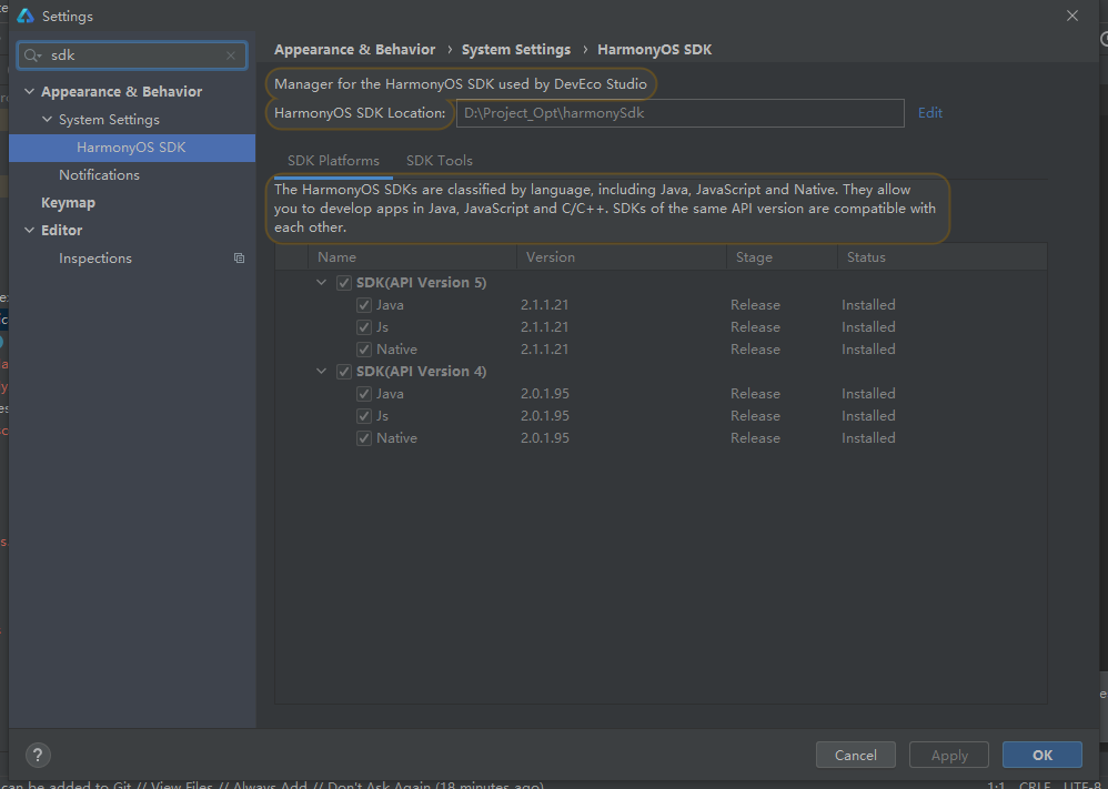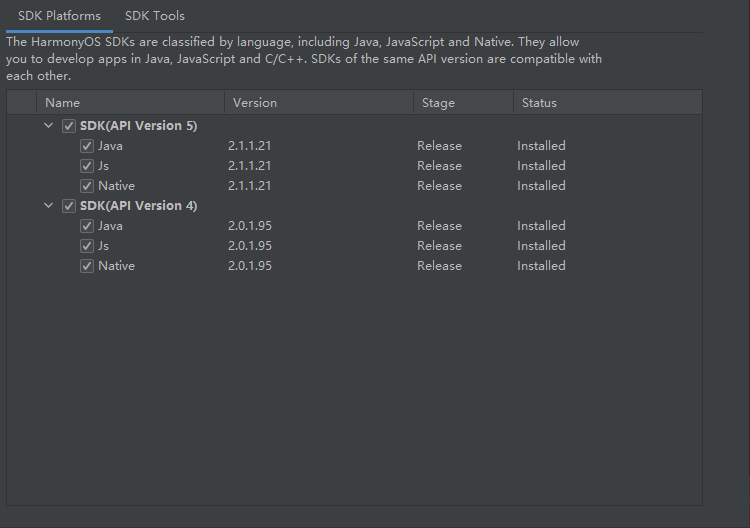 说明:HarmonyOs sdk按语言分类,包括Java、JavaScript和Native。它们允许你在java、javascript和C/C++中开发应用程序。同一API版本的SDK彼此兼容。