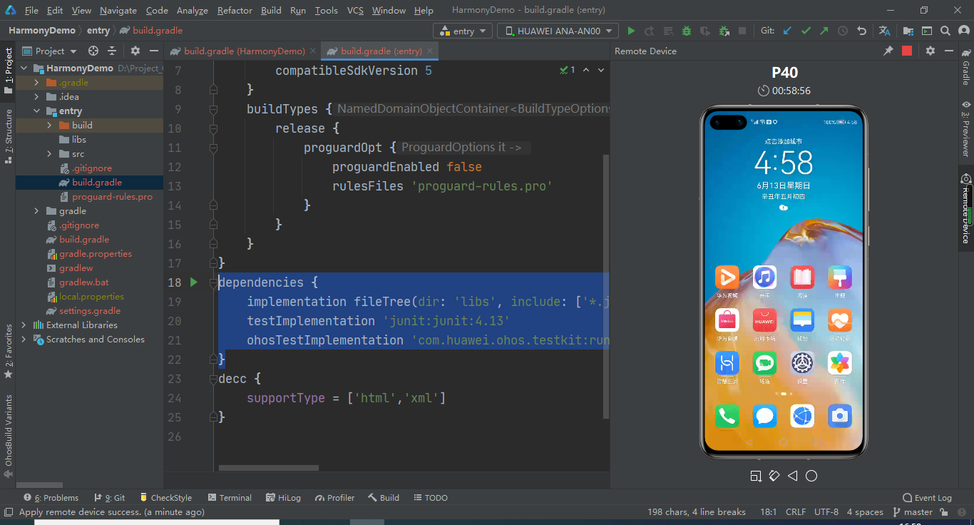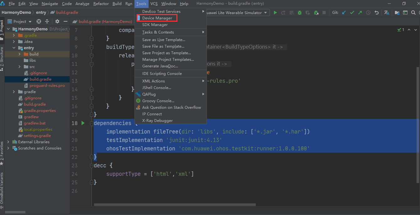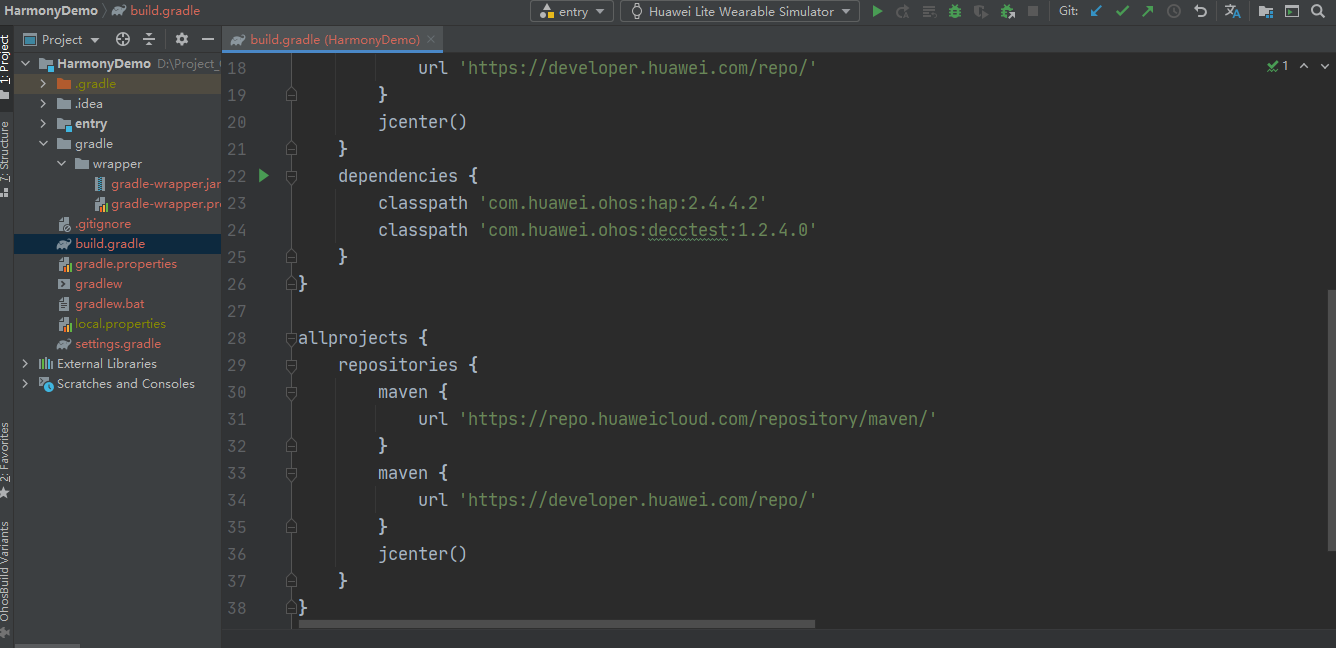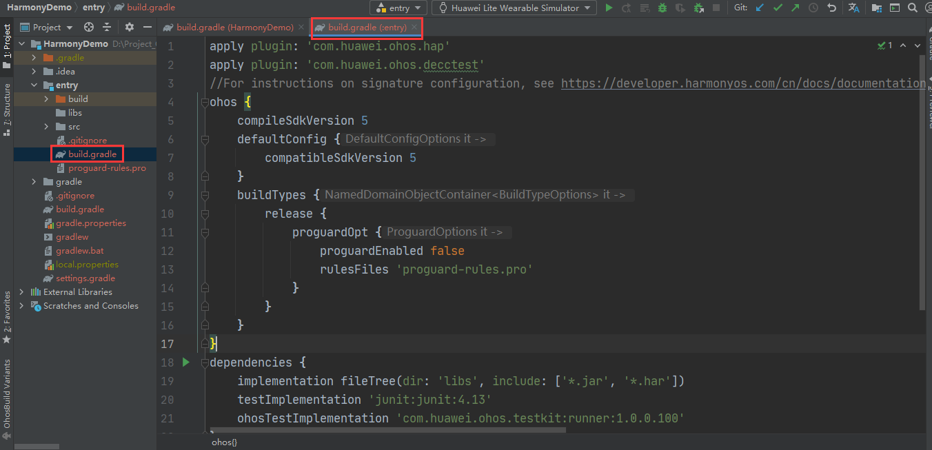 dependencies {implementation fileTree(dir: 'libs', include: ['*.jar', '*.har'])testImplementation 'junit:junit:4.13'ohosTestImplementation 'com.huawei.ohos.testkit:runner:1.0.0.100'